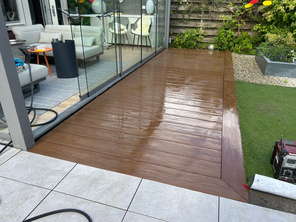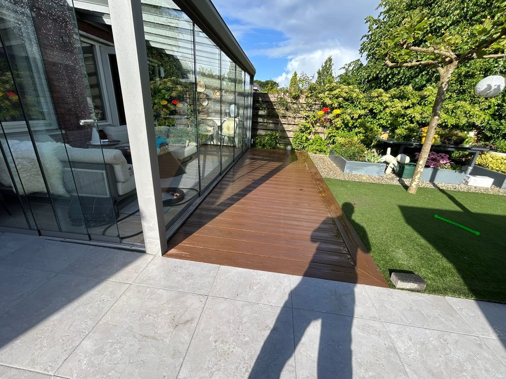 Aan de achterzijde van de woning is gekozen voor een composiet vlonder. Composiet is onderhoudsarm, duurzaam en kleurvast, waardoor de vlonder er jarenlang mooi uit blijft zien. Het geeft de tuin een moderne uitstraling en zorgt voor een warme overgang tussen woning en tuin.