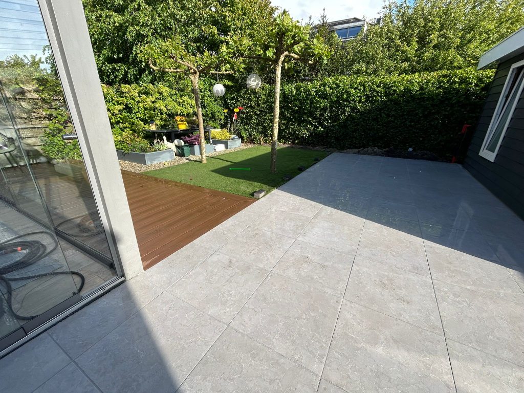 Een tuin vol vernieuwing: composiet vlonder, keramische tegels en kunstgras